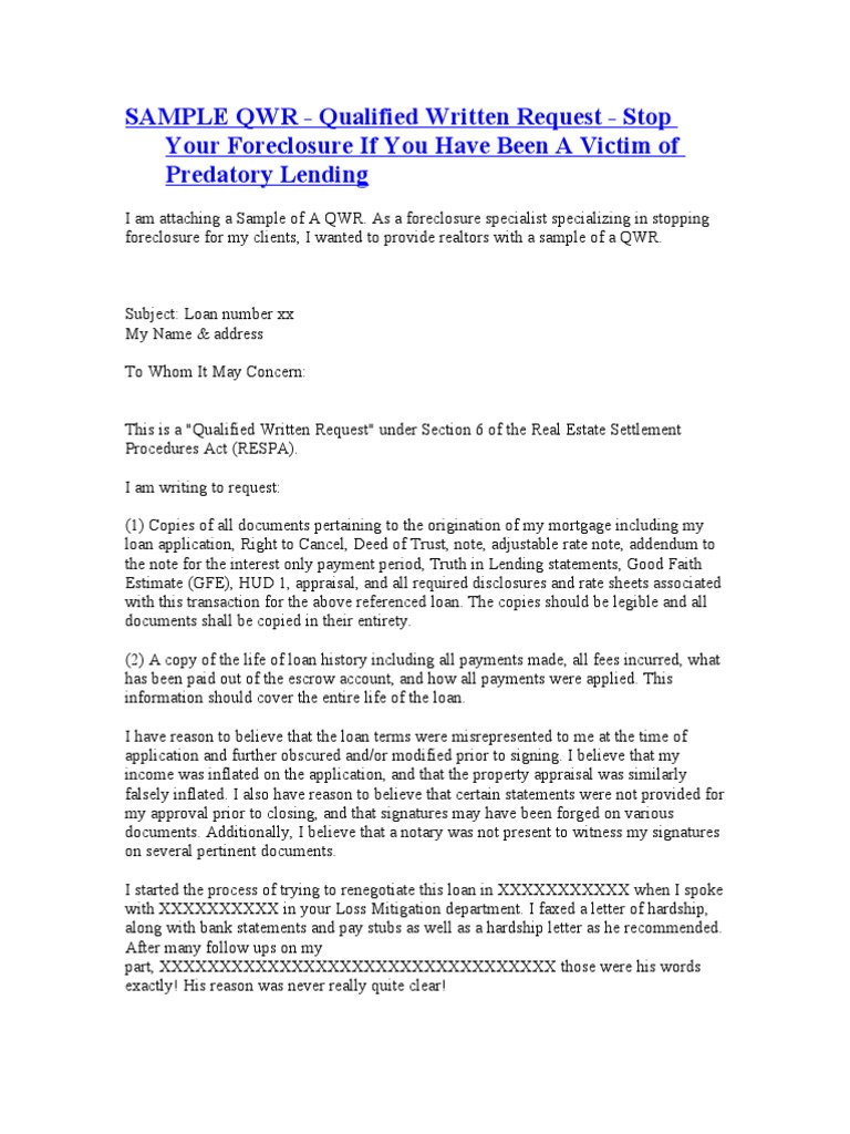 The foreclosure statement will be processed within 15 working days from the date of request. Making a qualified written request can also be very useful if you're facing a foreclosure. Discover request letters written by experts plus guides and examples to create your own request a cordial and tactful request may get you what you want! Write a request in your letter and write your goal. please tell us which questions below are the same as this one: